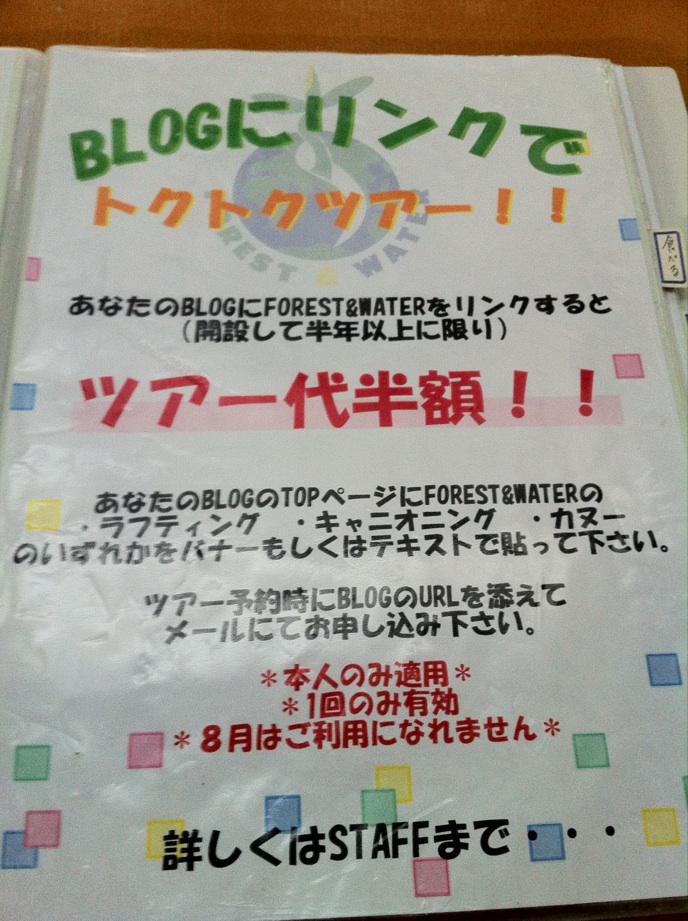 アウトドア屋forest@waterさん。 先日レイクカヌーに初挑戦してきました。 風もなく静まった湖面をスイスイ進んで行くと、 自然の中に自分が吸いこまれていくみたいな感覚に。 Blogにリンクを貼って、次回は半額でツアーに参加するぜ! http://www.fw-jp.com/minakami/canoe.php 2012/11/04(Sun) 17:19:42
